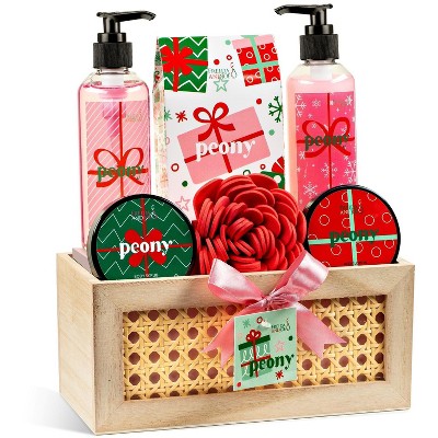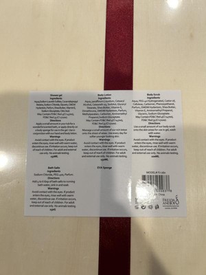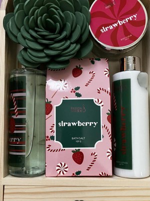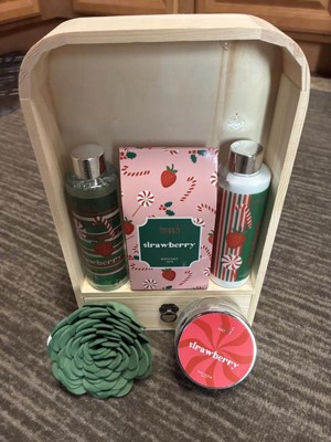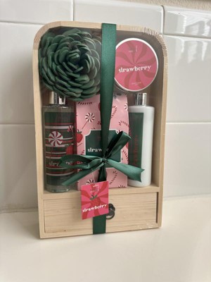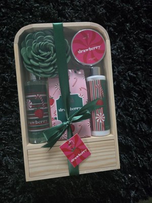 This holiday bath and body gift set with a strawberry fragrance makes an excellent gift. It is packaged with a nice wooden box and bow. The products all smell amazing. The shower gel feels good on my skin, as does the lotion. The exfoliator is a bit thin (minus one star) but still does a nice job of removing dead skin. I have not tried the bath salts yet, but am excited to do so. Overall, a great product!