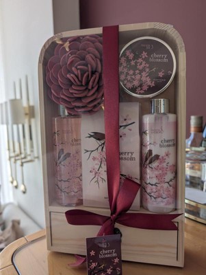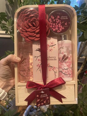 Cherry blossom smells heavenly. This set comes with a foam loofah in the shape of a rose, lotion, body scrub, and shower gel which is a plus! It's such a cute gift set to give as a gift or to keep! Ribbon and gift tag attached in order to gift. Would definitely buy more scents.