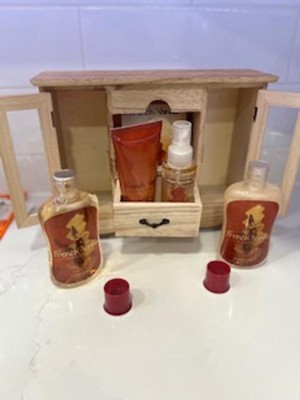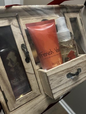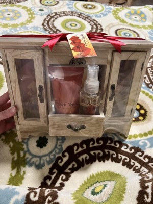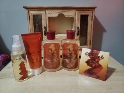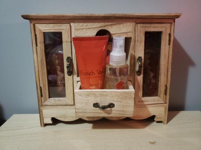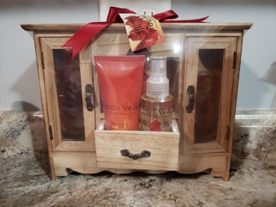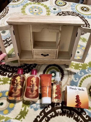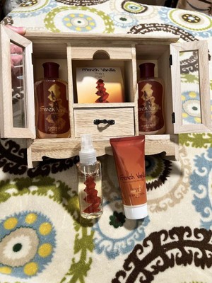 I was really excited about this gift set, but was pretty disappointed when I opened it up. The wooden cabinet is beautiful, but not very sturdy and the doors and drawer are wonky. I usually love french vanilla scented things, but these items smelled cheap and more like coconut than vanilla. The body lotion and body lotion were glued very securely to a plastic piece in the drawer, so now both have a permanent, sticky glue on them. I definitely wouldn't recommend this item.