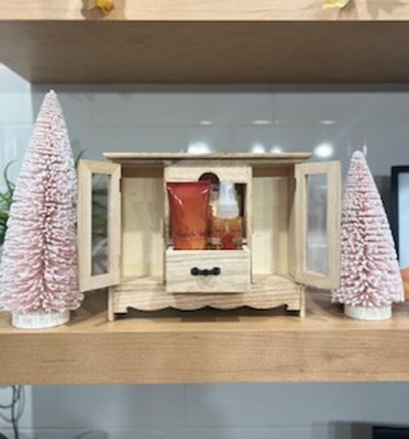 I purchased this as one of the many secret Santa gifts for one of my co-workers and I was impressed with the elegant look of this wooden curio- it is beautiful and I was proud to gift this to her! She really loves it ! I’m tempted to purchase another as a gift to myself now!! Such a darling way to display any little Knick knacks you might have- the bath stuff is just a sweet bonus!