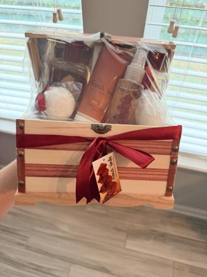 This is a nice gift set! Perfect for yourself or for gift giving. I really love cute design of the chest. It can long be used after the products inside are gone for keeping jewelry or other small items in. I did have a small mishap with mine and one of the boards came unglued but I was able to fix that right up. Hopefully it will hold but so far it seems good. The lotions, bath bombs, fragrance spray, shower gel etc all smell wonderful! They also leave my skin feeling moisturized and feeling fabulous! Overall I think that this is a great gift set and anybody would love to have this!