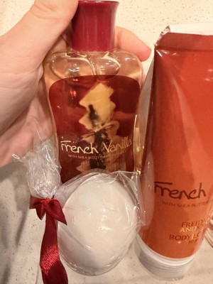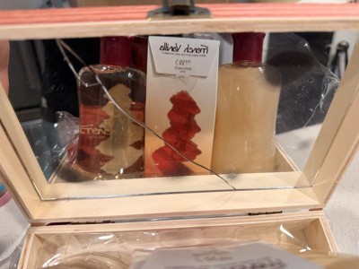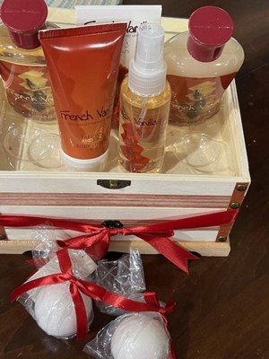 This is a really cute box. Love that it has a mirror inside plus a drawer that pulls out for versatility in storage options. I wouldn’t recommend shipping this product - my mirror was broken on arrival. The French Vanilla scent is a light and sweet scent. I like that they included the bath salts and the bath bombs in here, with lotion and body wash. This is the perfect gift set.