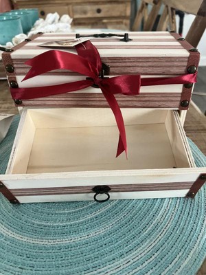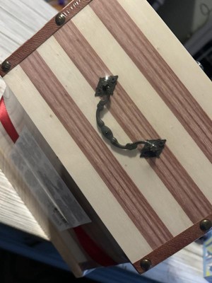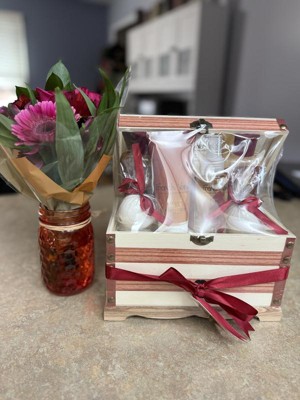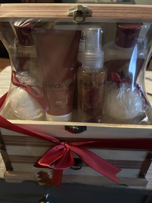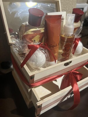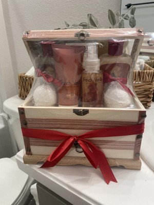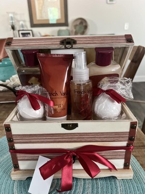 This beautiful wooden treasure box gift set is just amazing. It has a mirror and a drawer. The gift set includes 2 bath bombs, shower gel, bubble bath, bath salt pack, lotion and body spray. It smells really good. French Vanilla scent. It has a red ribbon. Very unique and stylish. Just the perfect gift. Highly recommended.