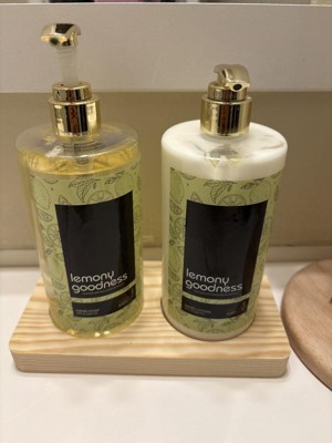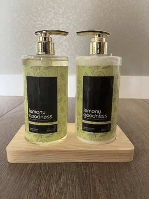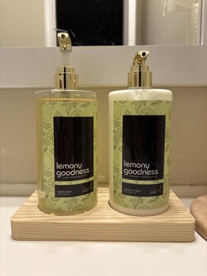 This soap and lotion set is a nice fresh lemon sent. Love it for my kitchen sink, it would also make it a lovely gift for someone. Love the nice little wooden block it comes on. Would also work nicely in a guest bath