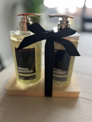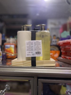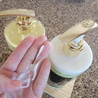 Beautiful and nice lotion and hand soap set! Packaging is beautiful, and I love how they look in my powder room. Nice large size products. Hand soap in one and a hand lotion in the other. Pretty light lotion, absorbs well and has a very fresh scent. Soap has a very light scent as well, pleasant to use.