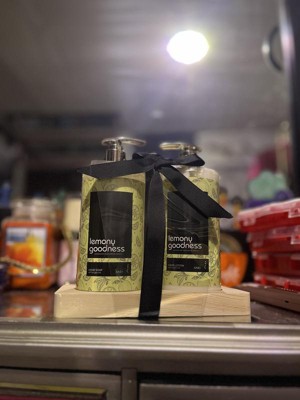 This comes in a cute gifting presentation so it's ready to pop into a bag for a last minute gift. The soap and lotion have a nice, mild, real-lemon scent (not like cleaning product lemon!). I like that it's not overwhelmingly strong where people smell you before they see you. The lotion feels a bit greasy going on, but absorbs quickly. The base looks like an unfinished pine. Overall, great choice for a quick gift.