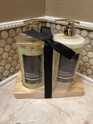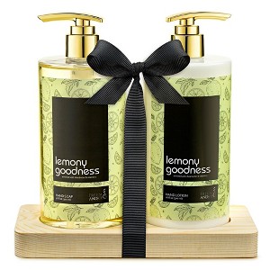 Holiday Spa Gift Basket – Lemon Citrus Hand Soap and Lotion Set in Decorative Tray – Luxury Body Care Set and Self Care Gift for Women