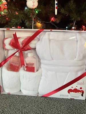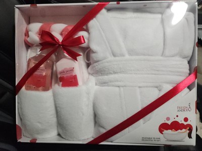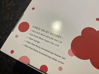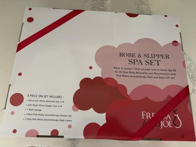 Beautiful set by Freida & Joe Pink Peony Fragrance Bath & Body Collection with Luxury Bathrobe & Slippers Gift Set. Made with high quality and well packaged. Made awesome present for spa lovers. I love that this set includes , cozy slippers, lotion, shower gel, scrubber and a luxurious bathrobe that can be a great addition to your morning or evening shower or simply a soft piece of clothing to wrap up in on a lazy weekend. Highly recommended!
