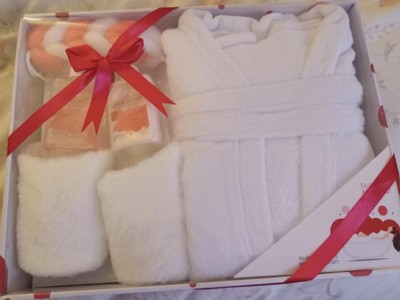 This is a nice set to give as a gift or buy as a gift for yourself. The lotion and shower gel have a fresh, floral scent, not cloying or artificial at all. The slippers are furry and soft with little rubber dots on the bottom to keep you from slipping. I like the braided loofah, it's thick and easy to use. The star of this set is the robe. It's so plush and cozy. I love how the sleeves are long instead of three quarters like some other robes. And the fact that it has two large pockets is just wonderful. The robe is true to size and just so comfortable to wear. This is a wonderful set. I highly recommend it.