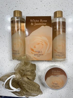 White Rose Jasmine Bath & Body Gift Set in Tub Basket with Shower Gel, Bubble Bath, Lotion, Bath Salt & Puff – Body Care Set for Women