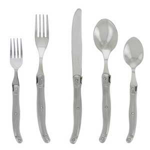 French Home's traditional Laguiole design translates effortlessly to today’s table-scape. The iconic three rivet curved handle and charming bee emblem on the bolster is comfortable to hold and perfectly balanced. Our 20-piece set is graceful enough for a formal dinner yet casual enough for your everyday family gatherings. The fully tanged flatware is made of stainless steel and are dishwasher safe making it practical for today’s busy lifestyles. Made with 1.8mm stainless steel the utensils are solid and feel substantial in your hand. The French bee is attached very close to the bolster for comfort and aesthetics. Laguiole is a town in France where this style of cutlery originated in the 1820's. The full set includes four 9.25" dinner knives, four 8.5" dinner forks, four 8.25" soup spoons, four 7.25" salad forks and four 7.25" dessert spoons.