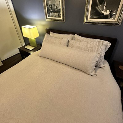We decided to add this Pebble Heather Pinstripe lumbar pillow to our queen size bed set. We did all the same color but having another layer of a long pillow is very cozy. I really like the size of this lumbar pillow, and the case came straight out of the dryer and right onto the bed and looks great. The linen feels soft and cool, it really breathes well and doesn't get hot at night. It's decorative but also comfortable to sleep with and use as a body pillow. Very soft and comfy!