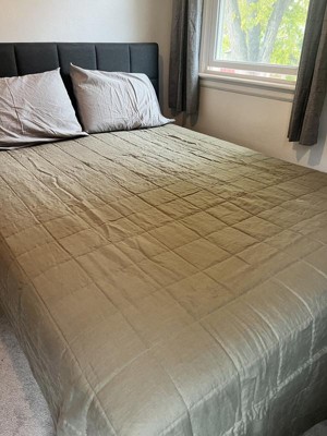 Wow, this quilt is the perfect replacement for a heavy down duvet option. If you sleep warm but like a little weight- it's wonderful. The green is soft and goes well with white, gray, blue. I really enjoy how it drapes over the entire bed. A real find in my opinon.