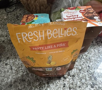 Best baby/toddler snack! Fresh bellies do not disappoint. The pineapple with a very mild kick of spice is a great combo. He loves it along with all the other fruits/flavors they over. We always keep these in stock in our pantry.