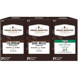 Because of its ideal climate, South America produces more than half of the Arabica coffee the world drinks, but the variations from the different countries make these coffees well worth exploring. The variety pack contains three very different, but very delicious selections from Brazil, Colombia, and Peru.Contains 24 pods each of the following coffees:Dark Brazil Cerrado - Medium-Dark Roast, Bold Body100% Colombian - Medium Roast, Bold BodyOrganic Peru* - Medium Roast, Bold BodyThis single-serve coffee is compatible with many popular K-Cup brewing systems including 2.0 and K-Supreme. Keurig and K-Cup are registered trademarks of Keurig Dr Pepper, Inc. Fresh Roasted Coffee LLC is neither an affiliate nor licensee of Keurig Dr Pepper, Inc. OU Kosher certified. Produced in an SQF certified facility. *Certified USDA Organic by Pennsylvania Certified Organic