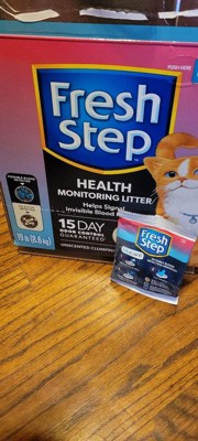 Monitor your cats health from home with Fresh Step Health Monitoring Cat Litter. Developed with a veterinary university, this unscented clumping litter includes color-changing Blucare granules that help signal the presence of invisible blood in cat urine, which may be a sign of urinary tract disorders. After your cat uses the litter box, the clumping cat litter granules turn blue within two minutes if possible blood is detected, and they remain visible for 48 hours. In addition to helping monitor your cat's health, this Fresh Step clumping cat litter delivers 15 days of odor control guaranteed (1), and it forms tight clumps for easy scooping. To use, evenly sprinkle about half of the granules pouch on top of the litter in areas where your cat frequently urinates, then monitor the granules for color changes daily. Cats are a mystery, but their health shouldnt be. Trust Fresh Step Health Monitoring Litter to easily monitor your cats health and detect potential illness early. USAGE DIRECTIONS: Fill your clean litter box with 34 inches of Fresh Step litter. Pour litter no more than a few inches from the box OR keep the carton close to the box when pouring litter. Open the Blcare granules pouch enclosed inside. Evenly sprinkle about half of the pouch on top of the litter, in areas where your cat frequently urinates. Monitor granules for color changes daily. Litter quickly forms a clump around liquid waste. Remove clumps and solids daily, and dispose in trash. Do not flush. CAUTION STATEMENTS: Toxoplasmosis Warning: We would like to remind our customers, especially pregnant women and immunosuppressed persons, that cat feces can sometimes transmit a disease called toxoplasmosis. Therefore, always remember to wash hands thoroughly after handling used cat litter. For further information, consult your doctor. Caution: Do not use this product as a traction aid, because product becomes slippery and slick when wet. Choking hazard. Keep out of reach of children.