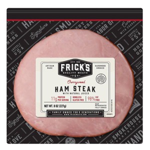 Frick's Cherrywood Ham Steak is cured with real cane sugar, cooked slowly, and smoked using real hardwood chips for superior smoky flavor. The ham comes to you fresh – never frozen – to preserve the juiciness, texture, and overall eating experience. Frick's, a 5th generation, American family owned company, sources and makes their meats in the U.S.