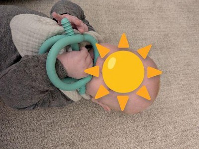 My baby is almost 5 months old and this is his favorite toy. He's my third baby so I have plenty of teethers and toys but for some reason he just didn't use any of them that much. He either dropped them or there wasn't a great way for him to hold them and get part of it in his mouth. This toy is absolutely perfect. It stays on his hand whether or not he grips it and he can easily get part of it in his mouth to chew on. He's able to play with it sitting up, laying down, and in his tummy. Frida Baby makes this toy in other colors (blue and pink) and I wish Target sold those options as I prefer the blue color.