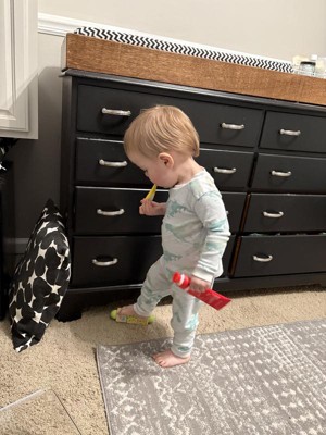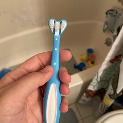 As a dental hygienist and a toddler mom, this is the toothbrush I constantly recommend for littles. It hits all of the tooth surfaces in one fell swoop, which is helpful for the times when kiddos are less cooperative with the brushing routine.