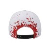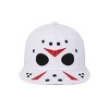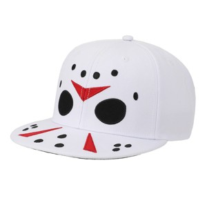 Embrace the horror with this white Friday the 13th snapback hat. Featuring a striking big face image of Jason's iconic mask on the front and chilling blood splatters on the back, this hat makes a bold statement. Made from durable polyester, it includes an adjustable strap for a personalized fit. Keep it looking sharp by hand washing in cold water and laying it flat to dry.