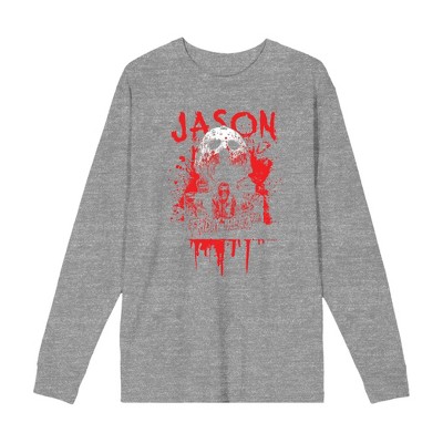 Experience the terror of Friday the 13th with this unisex adult athletic heather long sleeve hooded sweatshirt. Featuring Jason's iconic mask surrounded by blood splatters under menacing red letters spelling out his name, this hoodie captures the essence of horror. Crafted from a blend of cotton and polyester, it offers both comfort and durability. The adjustable hood adds an extra layer of mystery to your attire, making it perfect for both chilling days and spooky nights.