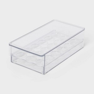 Maintain a more organized refrigerator with the Fridge Egg Holder and Dispenser from Brightroom™. This clear fridge egg holder is designed in a rectangular shape and holds up to 18 eggs. Made of BPA-free plastic, this egg holder and dispenser is also freezer safe, and it should be hand washed to clean.
