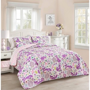 Add this adorable Pixie Fox Reversible Quilt Set to your child's space. The colorful print shows foxes frolicking in a flower field, almost like they are truly in motion. This quilt set is reversible, giving you two great looks in one affordable set. Flip the quilt over to reveal a cute multi-colored heart pattern. This girls bedroom decor will truly bring your kid's imagination to life! Decorate your toddler's or ween's woodland themed bedroom with this fun floral and fox printed set. Ideal for a first big kid bed or any school age child's bedroom makeover. This reversible microfiber bedding set offers softness and breathability. The cotton/poly blend filling is perfect for hot sleepers and great as an extra layer for those cold sleepers who layer-up to keep warm. This reversible 3 or 4 piece bedding set is available in twin or full/queen sizes, and includes 1 quilt, matching pillow shams (1 for twin, 2 for full/queen) and an adorable fox shaped decorative pillow. This bedding set is easy to maintain. Simply machine wash separately in cold water on the gentle cycle and tumble dry on low. If needed, use only non-chlorine bleach for cleaning or an iron on low heat to release wrinkles. Spot clean the decorative pillow. Please refer to label for full care instructions.