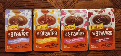 Feed your cat’s gravy fantasy with Friskies Lil’ Gravies Roasted Chicken Flavor Cat Food Complement. Made with yummy roasted chicken flavor, each pouch of gravy-licious goodness can be used as a topper for dry food or as a treat between meals. The savory recipe adds the excitement that your adult cat’s diet that she craves. And when you pair it with a crunchy dry cat food, she will enjoy the variety of texture and tastes down to the last bite. Each appetizing experience is packaged in a single-serving pouch, making it easy to shake, tear and pour your way to a delicious treat for your darling cat. We bet your feline friend can never get enough gravy in her bowl. So we made sure that each serving offers moisture to support healthy hydration and whisker-licking flavor. Friskies knows that feeding time is one of the highlights of the day you share with your cherished cat companion. That's why we're passionate about coming up with exciting combinations for you and your furry friend to discover. Backed by more than 90 years of Purina research and innovation, our team of experts creates treats that cats love. So let your cat dig in. It’s all gravy—with a whole lotta flavor!