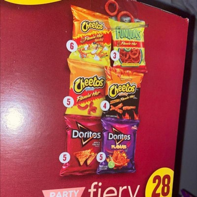 - Enjoy 2 (28 Count) Party Size Frito-Lay Variety Pack Fiery Mix boxes with your favorite hot & spicy flavors from Cheetos, Funyuns, and Doritos in one convenient pack