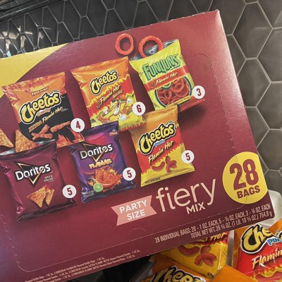 - Enjoy 3 (28 Count) Party Size Frito-Lay Variety Pack Fiery Mix boxes with your favorite hot & spicy flavors from Cheetos, Funyuns, and Doritos in one convenient pack