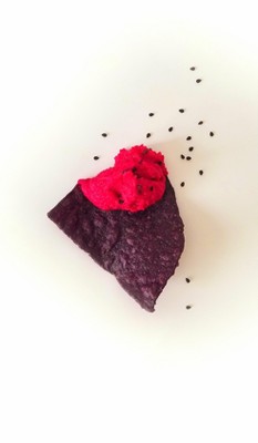 Chips arrived fresh (*perk*), crispy and delicious. Highly recommend and will be back for more. Pictured: Beetroot Hummus on blue corn tortilla chip