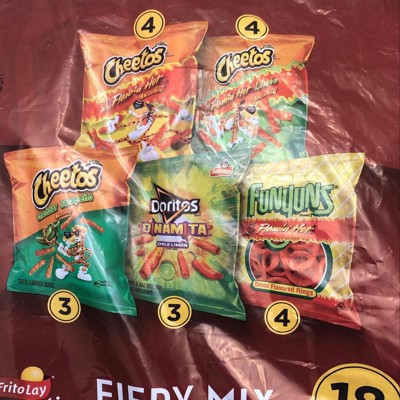 - 18 count mix includes LAY'S Flamin' Hot Potato Chips, DORITOS Dinamitas Tortilla Chip Snacks, Cheetos Crunchy Flamin' Hot Cheese Snacks, Cheetos Crunchy Flamin' Hot Limon Cheese Snacks, Cheetos Crunchy Cheddar Jalapeno Cheese Snacks and FUNYUNS Flamin' Hot Onion Flavored Rings Snacks