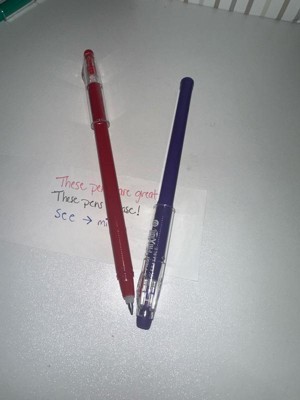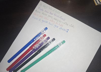 [This review was collected as part of a promotion.] Great set of pens! They write smoothly without and bumps. I appreciate how well the erase. The colors are bright and my daughter has loved them for school (she needs all these colors for editing her writings). While erasing, she hasn't had any issues with residue or damage to the paper.