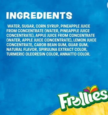 water, sugar, corn syrup, pineapple juice from concentrate (water, pineapple juice concentrate), apple, juice from concentrate (water, apple juice concentrate), lemon juice concentrate, carob bean gum, guar gum, natural flavor, spirulina extract color, turmeric oleoresin color, annatto color.' '