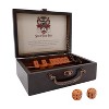 Shut-the-Box is a traditional English pub game of dice and numbers. After the sails were still and the nets had been reeled in and repaired, the Norman sailors and fishermen would pull out their dice and play Shut-the-Box. Authentic wood tiles and dice give this game its old century charm. Roll the dice and lay down the matching numbered tiles; players can challenge each other for the lowest score. Lay down all the tiles and you've "Shut-the-Box!" Box Size: 8"x6"x3".