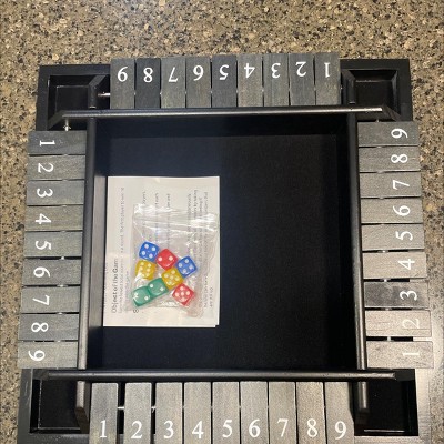 - Contents include: Large Wooden Shut-the-Box Game Board, 4 Pairs of Dice, Comprehensive Instructions