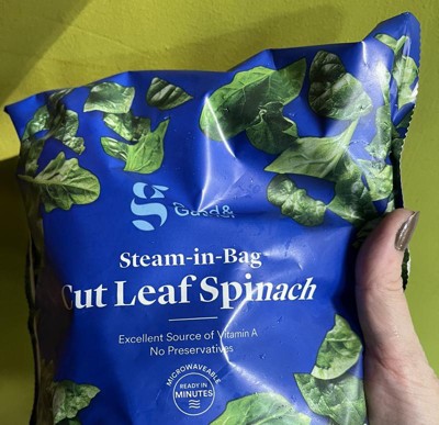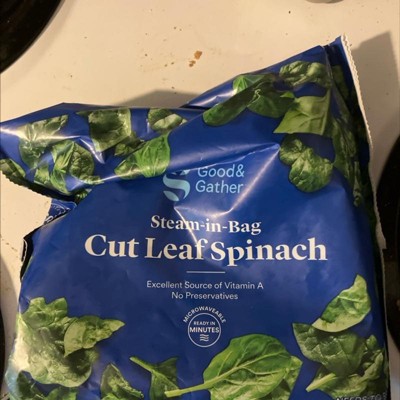 Getting your daily dose of leafy greens is easy when you keep frozen Cut Leaf Spinach from Good & Gather™ on hand. This cut leaf spinach has been frozen with no preservatives for fresh taste, and it's an excellent source of vitamin A, making it a great addition to your meals. The steam-in-bag spinach can be cooked in the microwave, letting you get it on the table in minutes. Turn the spinach into a delicious side by tossing with melted garlic butter and Parmesan cheese. However you choose to enjoy it, you'll appreciate that the leaves are already cut, paring down your prep time even more.DirectionsNeeds to be fully cooked. Keep frozen until ready to prepare.For food safety, cook to 165°F until hot throughout. Appliances may vary; adjust cooking time accordingly.Refrigerate or discard leftovers immediately.MicrowaveDo not puncture or open before microwaving.1. Place unopened bag THIS SIDE UP in microwave oven. Evenly distribute spinach inside. 2. Microwave on HIGH for 6 minutes until hot.**3. Let stand 1 minute. Bag will be hot; lift from corners. Open carefully. **Directions developed for 1100 watt microwave ovens. Cooking in ovens of lower watts will require additional time.Stovetop1. Combine spinach and 1/3 cup water in large saucepan.2. Cover and cook over MEDIUM heat for 9 minutes or until hot, stirring frequently.3. Drain. Season to taste; serve.