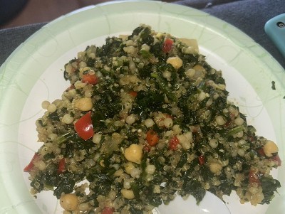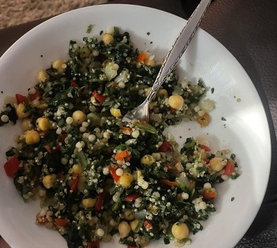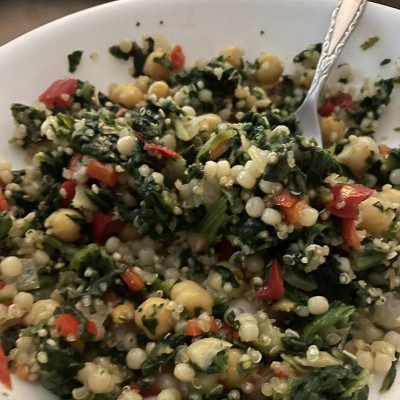 - Made with quinoa and couscous, spinach, chickpeas, red pepper and onion and seasoned with oil and salt
