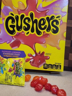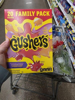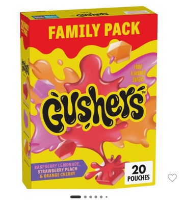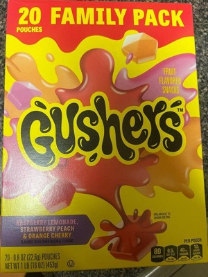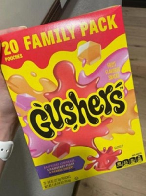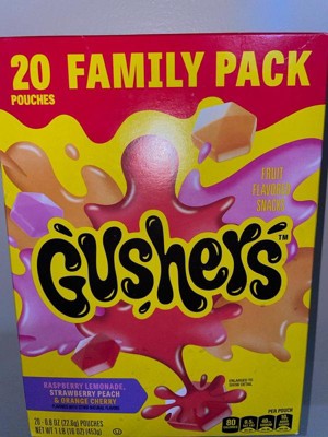 - CONTAINS: One 16 oz Family Pack of Gushers, Raspberry Lemonade, Strawberry Peach, Orange Cherry; 20 pouches