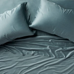 Drift into blissful sleep with this Rayon from Bamboo Sheet Set from Casaluna™. This four-piece bedding set includes one fitted sheet, one flat sheet and two pillowcases, all designed in a solid shade for a refined touch. Each piece is made from rayon sateen with a 400-thread count for a soft feel, subtle shine and lasting comfort. Plus, they can be easily tossed in the washing machine for hassle-free cleaning.