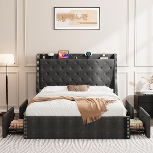 Bed Frame with Storage, 4 Under Bed Drawers and Wingback Headboard, Type-c and USB Ports, Diamond Tufted Upholstered Platform