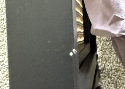 1. The corner of the bed frame has a noticeable misalignment, with metal edges not flush or properly finished. This creates a sharp, protruding edge that poses a safety risk, especially in a home setting. 2. There’s visible paint chipping and uneven metal joint