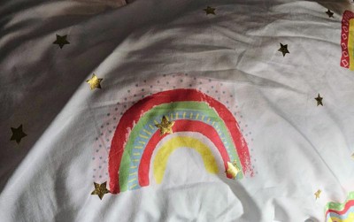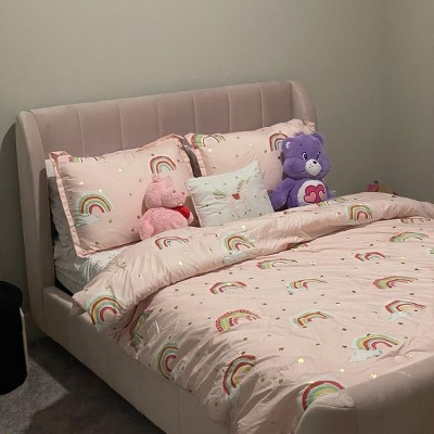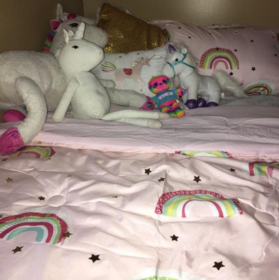 Bring a whimsical charm to your girl's bedroom with the Natalie Rainbow and Metallic Stars Comforter Set with Bed Sheets. An adorable rainbow and metallic star print adorns the comforter and 2 shams (1 in Twin/TwinXL) for a cute and playful look. The included complete sheet set features a fun unicorn print that coordinates beautifully with the kid's comforter set, while an oblong decorative pillow provides a fun finishing touch. Hypoallergenic polyester filling in the comforter and decorative pillow provide extra softness and comfort. Machine washable for easy care, this kid's comforter and sheet set brightens up your child's bedroom with its delightful allure. This bedding set uses an antimicrobial treatment that provides built-in freshness protection, reducing the growth of odor causing bacteria to keep fabric lasting longer. Items in the set may come in a rolled or compressed packaging, which will need to be fluffed up or steam ironed before use to remove wrinkles.