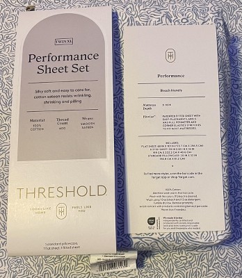 Give your bed a new look and feel with a Performance Sheet Set from Threshold. They are our most popular sheets for good reason soft, durable and easy to care for. The fresh selection of prints means there's just the right set to complement your bedding collection. We’re committed to making products better for you, and the world. This product is Standard 100 by OEKO-TEX certified, meaning that everything from the dyes and fabrics to accessories like buttons and zippers are tested and verified as free from harmful levels of more than 300 substances.