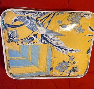 This nicely colored yellow and blue/gray set is not a quilt or comforter as advertised. I returned it as soon I received it and opened the box it arrived in once I saw that it is a thin(about a quarter 1/4 of an inch) coverlet as you see in a motel. Not worth the high price I paid. I wish this was not the case. I would be hesitant to wash this set.