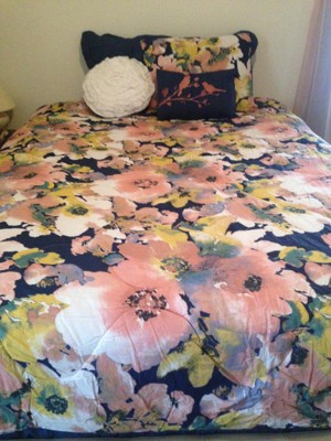 Add a touch of charm and color to your bedroom with the Lush Decor Floral Watercolor Blue 7-Piece Comforter Set. This soft, inviting bedding ensemble showcases an artful floral print in shades of navy, blush, white, and butter yellowa painterly design that feels both vibrant and romantic. The look is elevated with matching shams and two solid Euro navy shams with flanged edging, giving the set a crisp, finished style that complements classic, traditional, cottage, and vintage-inspired bedrooms. Crafted with a smooth 100% cotton face fabric, this comforter offers breathable softness and lightweight comfort for year-round use. The soft fill keeps it cozy without feeling heavy, making it ideal for warm sleepers or those who love layering their bedding. Each detailfrom the delicate ruffled round decorative pillow to the embroidered rectangular throw pillow featuring pink birds perched on a navy branchadds a personal, handcrafted touch that completes the look. Designed for effortless layering and easy coordination, this floral bedding set is the perfect blend of elegance and comfort. The soft watercolor blooms create a sense of calm and sophistication, while the navy borders ground the design, making it equally at home in feminine, classic, or transitional décor. Whether styled with lace-trimmed sheets for a cottage bedroom or paired with clean, white linens for a modern vintage twist, this bedding set makes any space feel welcoming and beautifully put together. This 7-piece comforter set includes one comforter, two pillow shams, two decorative throw pillows, and two euro shamseverything you need for a complete, polished bed. Lightweight yet plush, its ideal for use in spring and summer or layered with blankets in cooler seasons. Easy to care for and made with attention to quality, the Lush Decor Floral Watercolor Blue Comforter Set brings together artistry, color, and comfort for a look that feels timeless, feminine, and effortlessly chic.