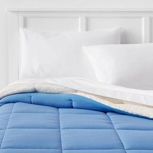 Escape to your dreamland in cozy comfort with the Faux Shearling Washed Microfiber Reversible Comforter from Room Essentials™. Boasting a super-soft, washed quilted fabric on one side and plush faux shearling on the other side, this microfiber comforter feels soft against your skin and helps keep you cozy all night. Featuring a dual-hue design with white faux shearling at the reverse and a solid quilted front, this comforter instantly enlivens your sleeping space. Simply coordinate it with a matching sham, contrasting sheets and fluffy pillows to transform any bedroom in your home into a cozy and colorful relaxing haven.