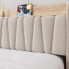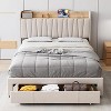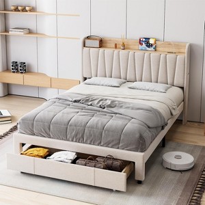 Upgrade your bedroom with this Upholstered Platform Bed Frame, designed for style, comfort, and smart storage. The high, padded headboard offers plush support for reading or relaxing, wrapped in soft beige linen fabric for a sophisticated look. Built-in storage headboard compartments let you keep books, glasses, or decor conveniently nearby, while the integrated charging station (2 USB ports + 1 AC outlet) keeps your devices powered up. A roomy storage drawer with smooth casters provides extra space for off-season clothes, linens, or pillows, helping keep your room neat and organized. The sturdy metal frame and durable wooden slats support up to 1,000 lbs and eliminate the need for a box spring, while the noiseless design ensures restful, squeak-free sleep. Easy-to-follow instructions make assembly quick and simple.
