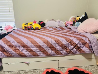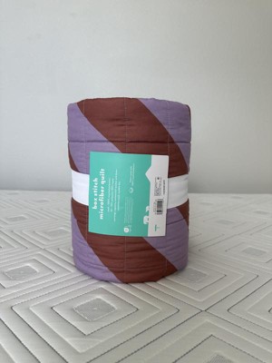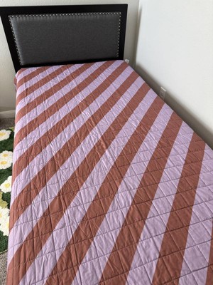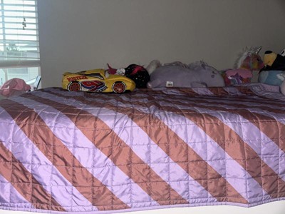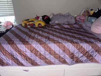 Bring timeless style to your child’s bedroom with this Striped Quilt from Pillowfort™. This microfiber quilt is made from 100% recycled polyester with recycled polyester lining and polyester-rayon blend filling to provide year-round, cozy warmth. It showcases a purple-and-brown striped design with a stylish stitching pattern that adds a decorative touch to the top of the bed. Plus, the machine-washable construction allows for hassle-free cleaning.