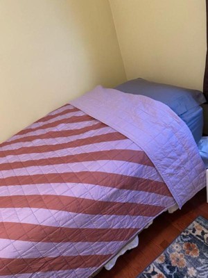 The purple and brown stripes on this quilt look absolutely beautiful! I love the color combination—it’s unique, and the two-tone stripes give it a modern vibe that works great for a kid’s room. It’s lightweight, so my daughter can easily spread it out on the bed by herself. Plus, it’s soft to the touch and feels really comfortable. Taking care of it is super easy—just toss it in the washing machine, and it comes out looking fresh!